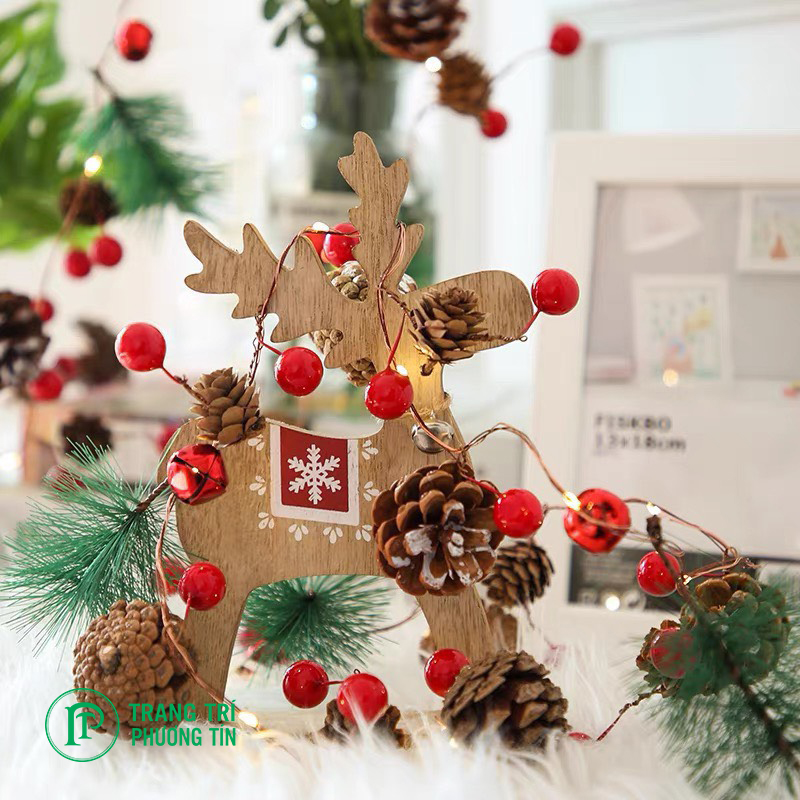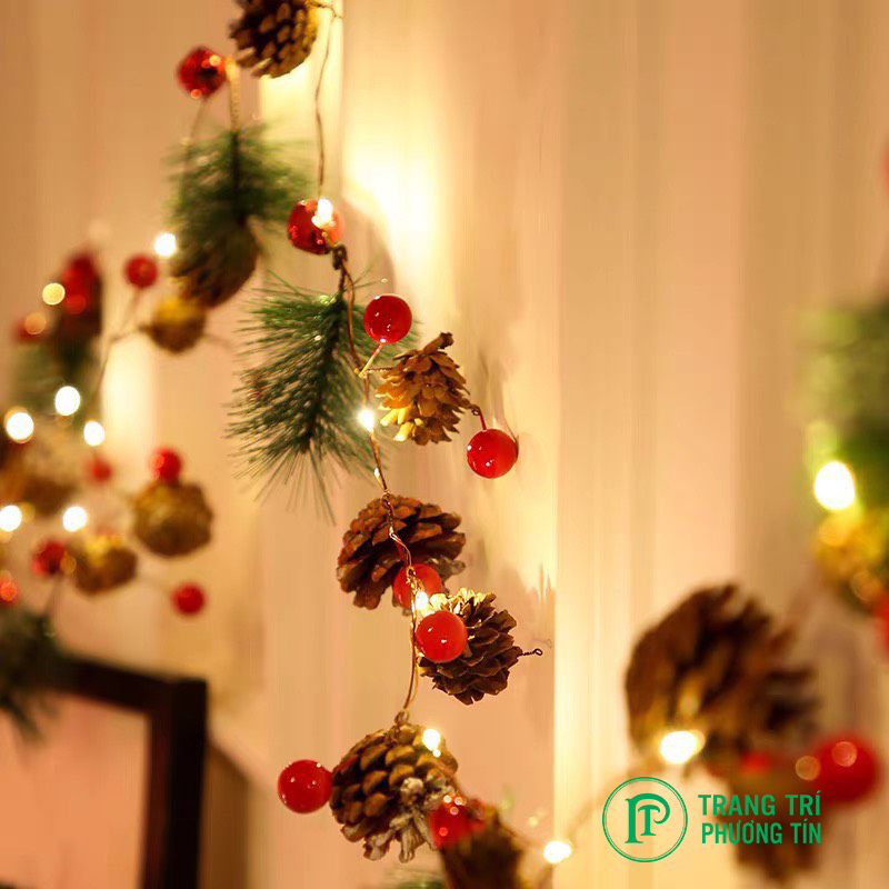 Với dây đèn dài, trang trí với các quả châu và quả thông khô, bạn có thể dễ dàng quấn quanh dây đèn cho cây thông Noel, đàn tuần lộc, hay các nơi cần trang trí trong nhà.