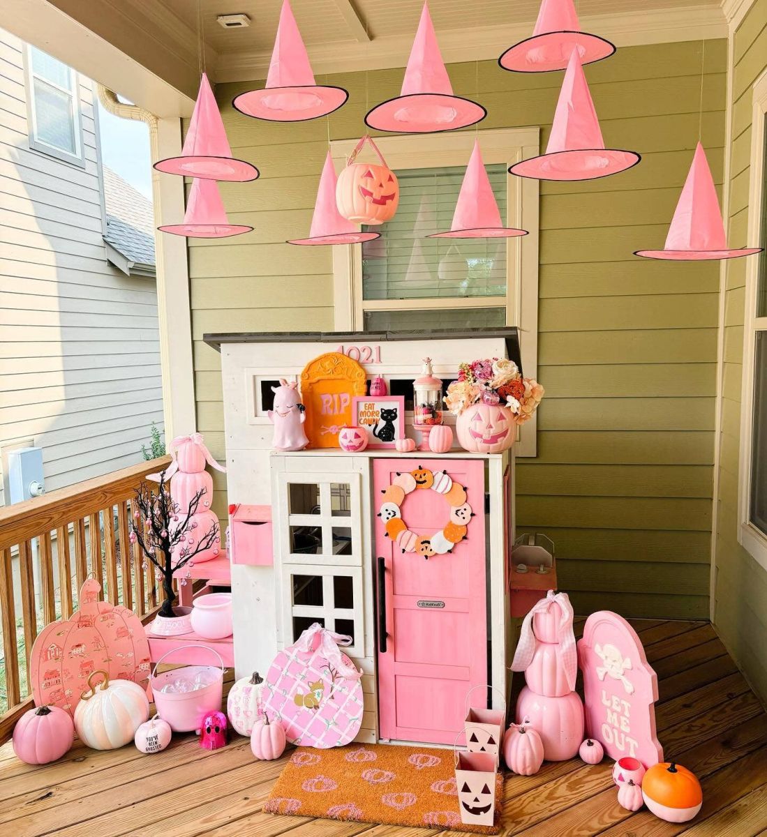 Sử dụng mạng nhện giả, dơi giấy treo lủng lẳng trên mái nhà, và dán hình ma trắng lên cửa sổ. Thêm vòng hoa từ lá khô và bí ngô nhỏ quanh lối vào để tạo cảm giác rùng rợn nhưng dễ thương.