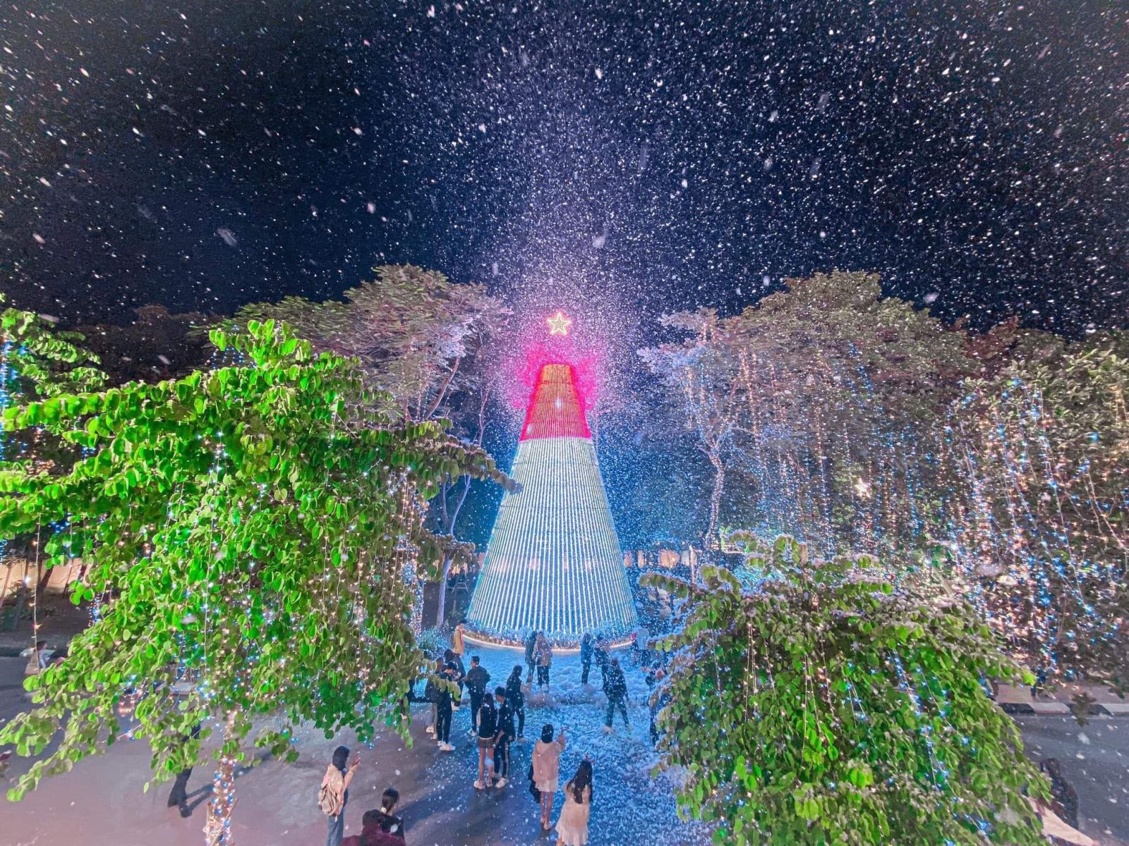 Với khí hậu tại Việt Nam không có tuyết, nên chúng ta phải dùng máy tạo tuyết. Sử dụng dung dịch tạo tuyết, sau đó cho vào máy bắn tuyết để bắn vào các thời điểm quan trọng, có đông người… và chắc chắn không thể bỏ qua bắn “tuyết rơi” là ngày Giáng sinh.